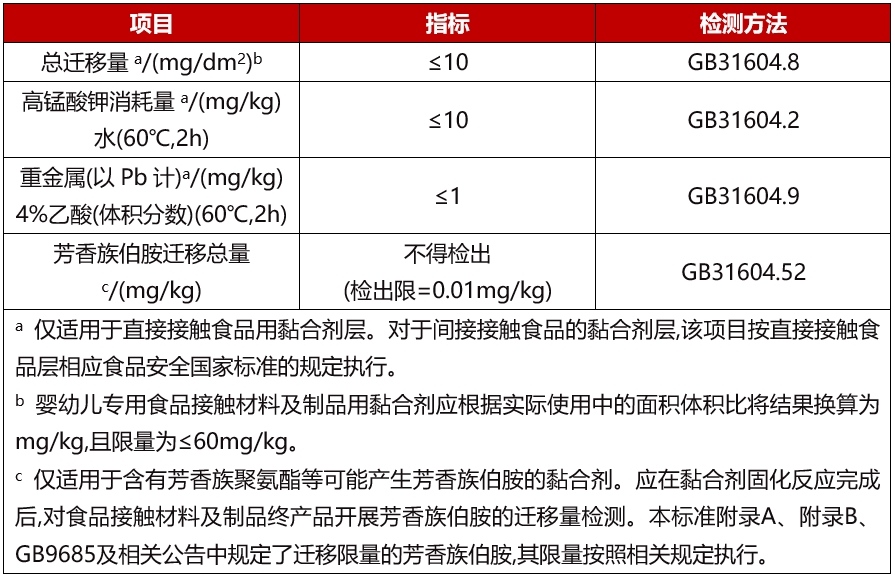 2. 食品接觸材料及制品用黏合劑應(yīng)符合GB9685及相關(guān)公告對(duì)添加劑的SML、SML(T)、QM等理化指標(biāo)的規(guī)定。