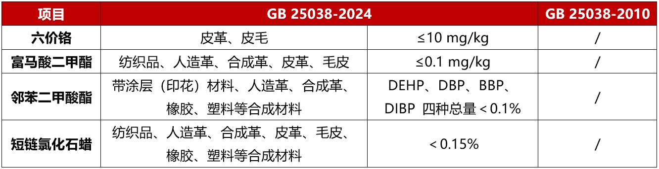 ● 新增了六價(jià)鉻、富馬酸二甲酯、鄰苯二甲酸酯、短鏈氯化石蠟4項(xiàng)化學(xué)物質(zhì)的要求;