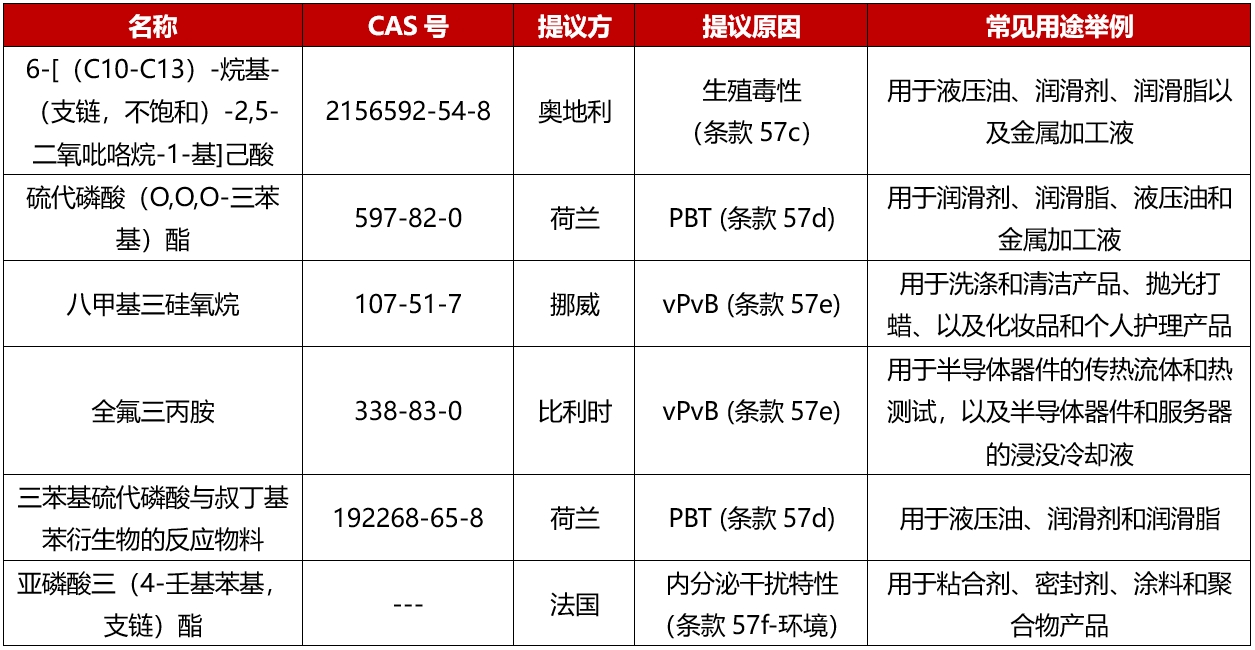 2024年8月30日,歐洲化學(xué)品管理局(ECHA)公布對6種潛在的SVHC候選物質(zhì)展開公眾咨詢,此次公眾咨詢期持續(xù)到2024年10月14日,利益相關(guān)方可在此期間向ECHA提交反饋意見。ECHA將會(huì)對公眾提交的反饋意見進(jìn)行評議,最終確定正式納入第32批SVHC候選清單的物質(zhì)。