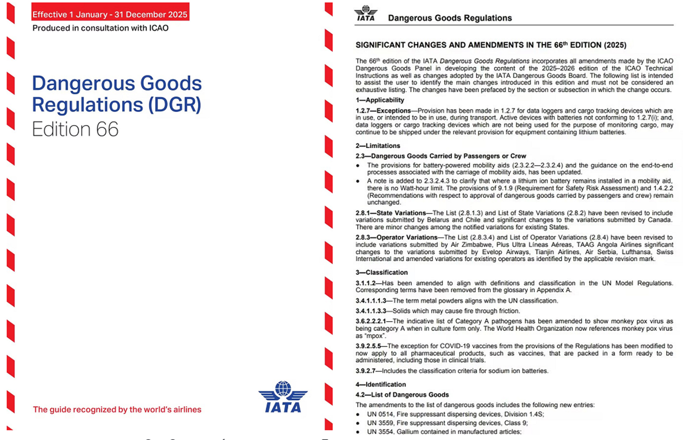 近日IATA(國際航空運輸協(xié)會)發(fā)布了第66版DGR(危險品規(guī)則),從2025年1月1日起,第66版IATA危險品條例(DGR)和第12版鋰電池運輸條例(LBSR)正式生效。