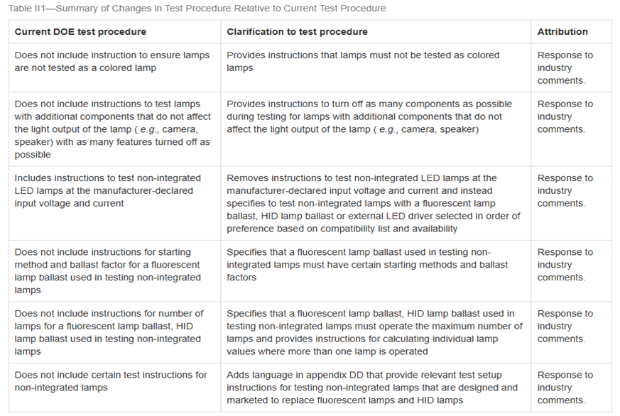 DOE至少每7年評估一次不同產(chǎn)品的測試程序,以確定修改后的測試程序是否更準(zhǔn)確的符合實際要求,在技術(shù)上是否可行、在經(jīng)濟(jì)上是否合理。在此次的《聯(lián)邦公報》最終規(guī)范中,針對通用照明燈泡(GSLs)測試程序,DOE 對Subpart B of Part 430中的appendix W, appendix BB和appendix DD測試方法提出最終說明。