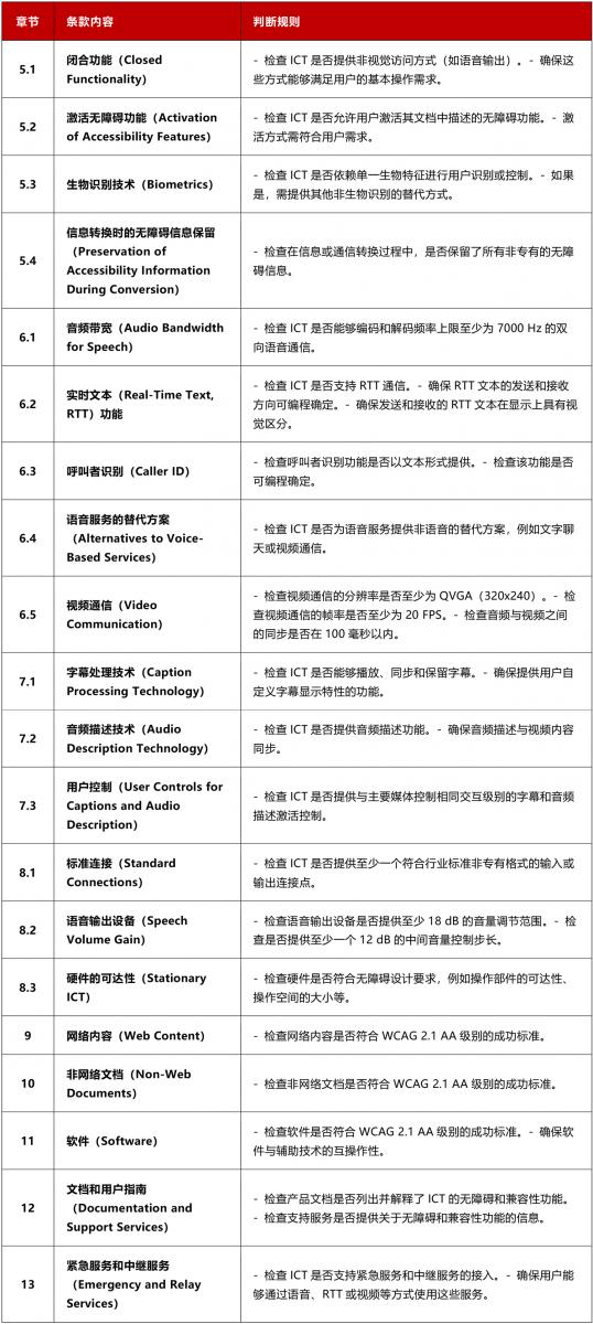 • 標(biāo)準(zhǔn)中包含了關(guān)于語(yǔ)音、視訊通訊、硬體、網(wǎng)頁(yè)、文件、軟體、緊急服務(wù)各方面的具體測(cè)試程序和評(píng)估方法,確保不同產(chǎn)品在無(wú)障礙方面達(dá)到統(tǒng)一的合規(guī)標(biāo)準(zhǔn)。