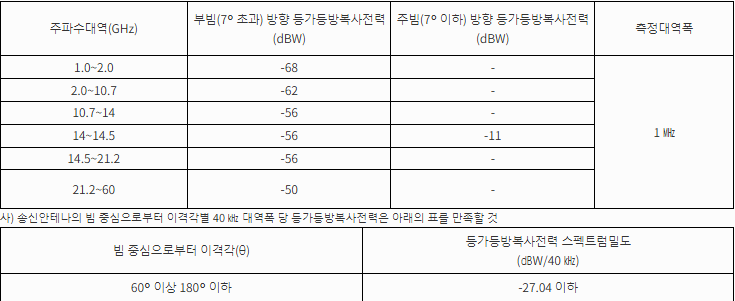 頻率容差應(yīng)符合“無線電臺(tái)規(guī)則”第5條規(guī)定的條件。在不進(jìn)行發(fā)射的狀態(tài)下(載波發(fā)射禁用狀態(tài)),其伴隨的電波輻射的等效全向輻射功率譜密度不應(yīng)超過下表所列的數(shù)值。