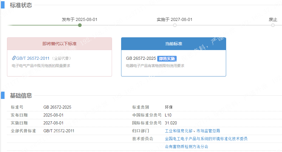 2025年8月1日,中國國家標(biāo)準(zhǔn)化管理委員會(國標(biāo)委)正式批準(zhǔn)發(fā)布強(qiáng)制性國家標(biāo)準(zhǔn)GB 26572-2025《電器電子產(chǎn)品有害物質(zhì)限制使用要求》。新標(biāo)準(zhǔn)將替代原推薦性標(biāo)準(zhǔn)GB/T 26572-2011,成為中國RoHS管控領(lǐng)域首個強(qiáng)制性國家標(biāo)準(zhǔn),并將于2027年8月1日正式實(shí)施。