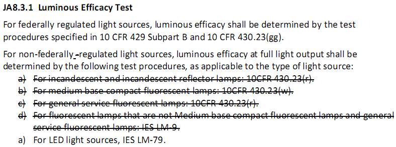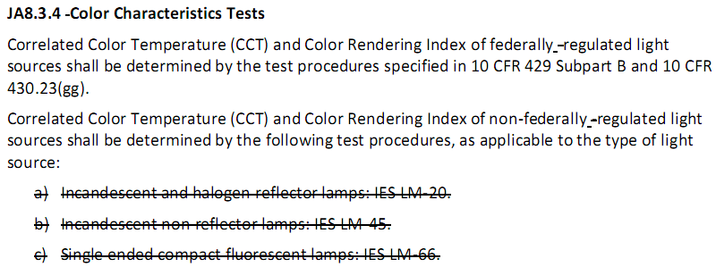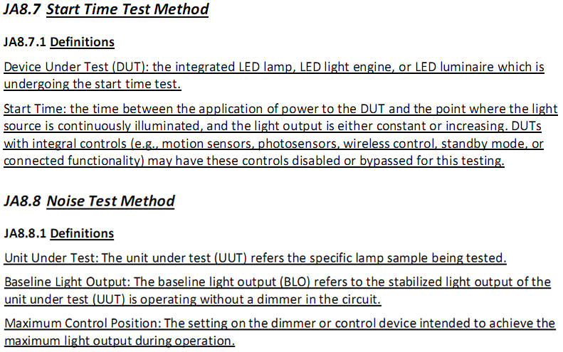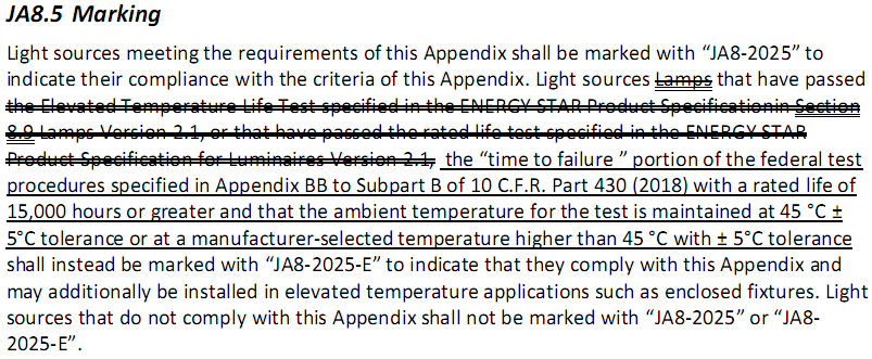 更新五:標(biāo)識(shí)Marking更新為JA8-2025或者JA8-2025-E,同時(shí)光源采用DOE 中Appendix BB to Subpart B of 10 C.F.R. Part 430的壽命老化方法,只有老化環(huán)境溫度為45°C±5°C或者制造商選擇更高的老化溫度才能打JA8-2025-E的標(biāo)識(shí)