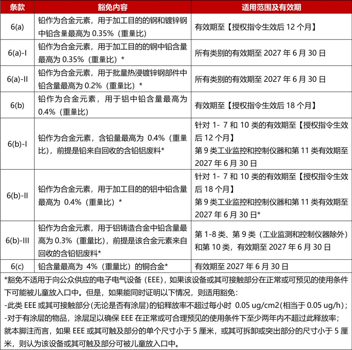 關(guān)于鋼合金、鋁合金和銅合金,RoHS指令附錄III的6(a), 6(a)-I, 6(b), 6(b)-I, 6(b)-II 和 6(c) 條款被替換為以下內(nèi)容: