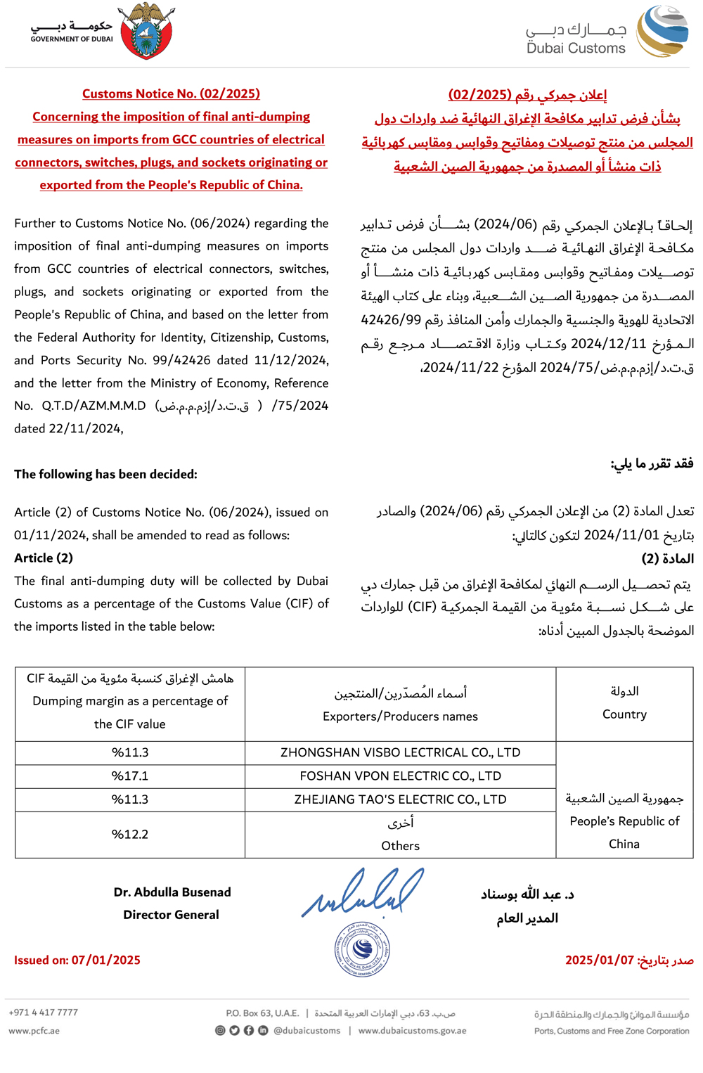 2025年1月7日,迪拜海關發(fā)布了一項新公告(編號02/2025),宣布將對從海灣合作委員會(GCC)成員國進口、且原產地為中國的一系列產品實施最終反傾銷措施,相關產品包括電氣連接器、開關、插頭和插座等。