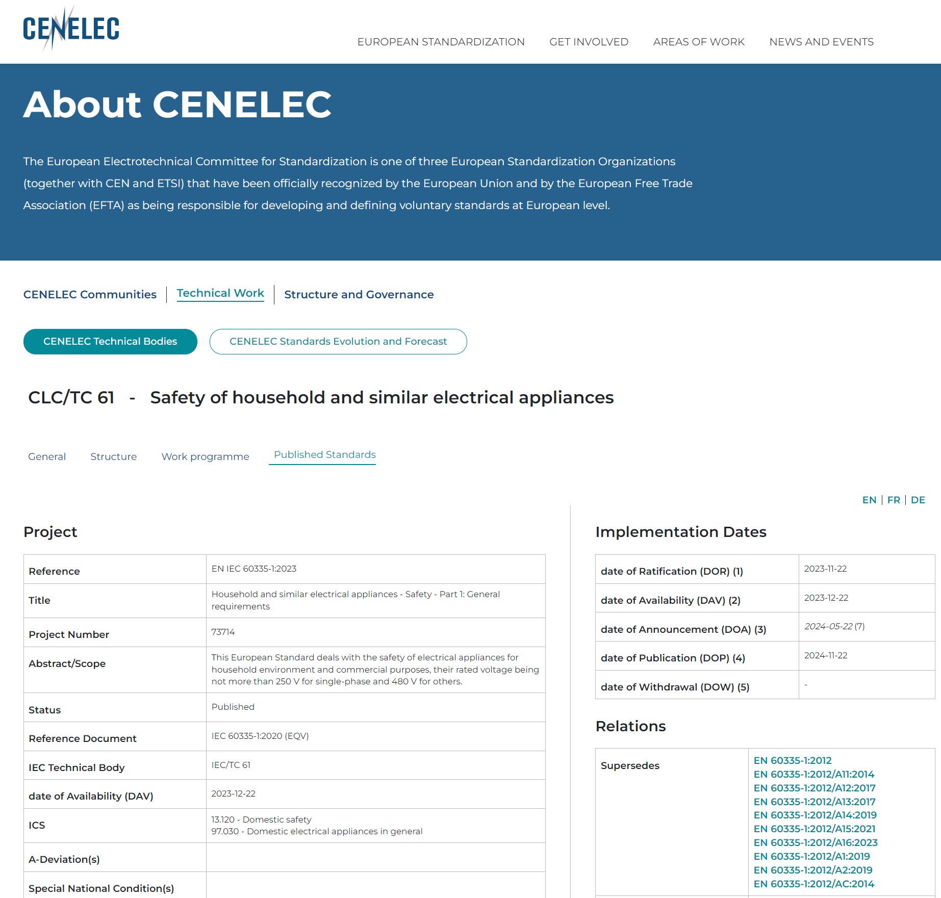 歐盟家電安全新標準EN IEC 60335-1:2023于2023年12月22日正式出版,DOP 發(fā)布日期是2024年11月22日, 該標準涵蓋了最新出現(xiàn)的許多家電產(chǎn)品的技術要求。